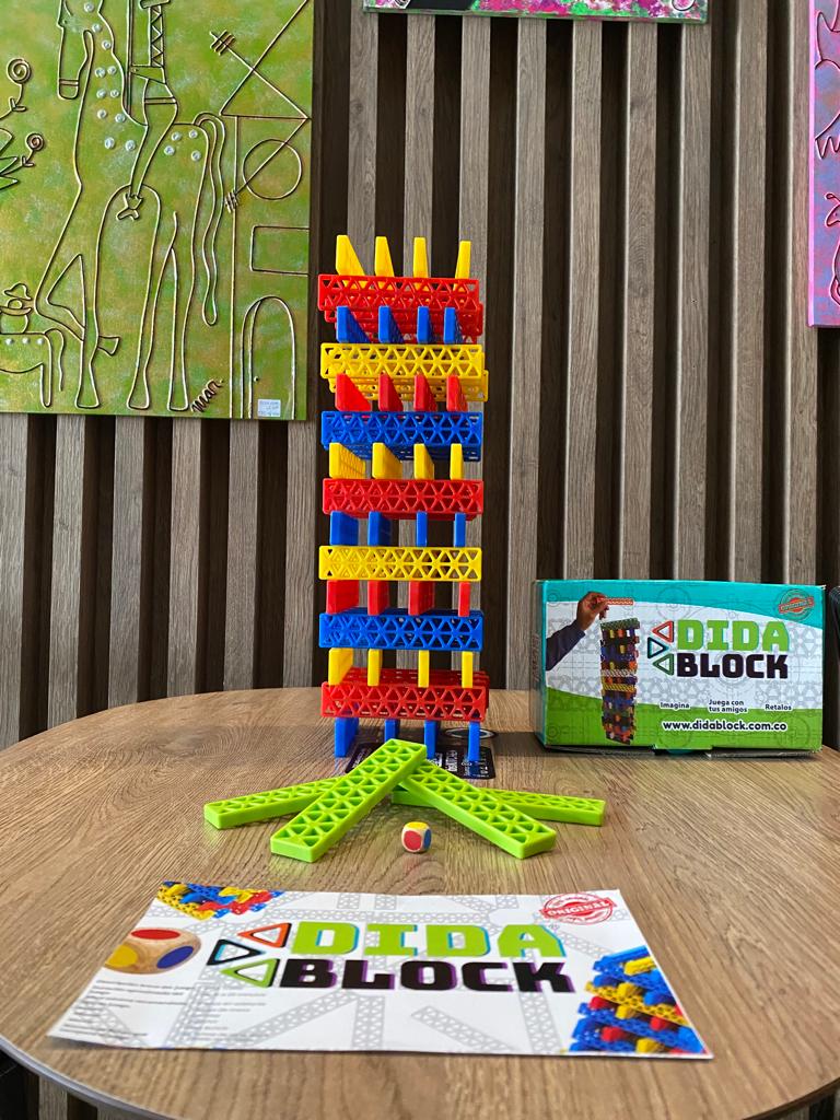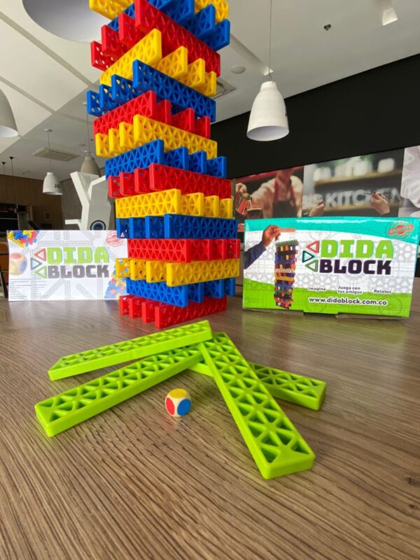 La caja de DIDA TORRE viene con 64 fichas de DIDA BLOCK + 1 dado de colores (amarillo, azul, rojo y verde). Cada jugador trata de «ponérsela difícil» a los demás jugadores pues cada uno pone las piezas de tal manera que al siguiente le cueste poner las figuras que le corresponden, a quien se le caiga la torre formada por todos debe cumplir una divertida penitencia pactada por el grupo. Entre todos los jugadores construyen la torre. La torre es de 15 pisos donde se pueden combinar los colores amarillo, azul y rojo. En cada superficie debe haber 4 fichas. Por mutuo acuerdo deciden quien comienza a retirar las fichas y apilarlas en la parte superior. Cada jugador lanza en su turno el dado de colores y el color que caiga será la ficha para retirar y ubicarla en la parte más alta de la torre. Hay 4 fichas de color verde el cual cada jugador usara como ayuda en caso de que no quiera retirar de la torre, pero solo se podrá usar cuando el dado salga de color verde (Solo hay una oportunidad de usar la ficha verde). Desarrolla tolerancia a la frustración con este juego de competencia.